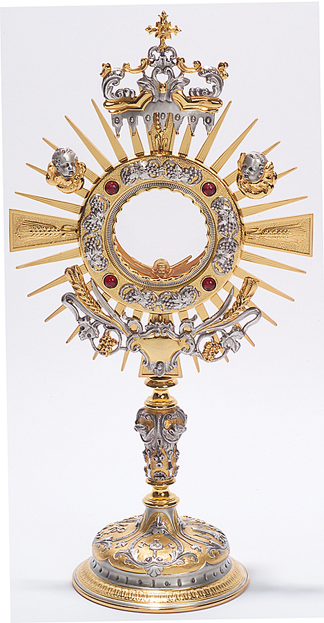 Monstrance - Silver and 24k Gold Plated. 18" H, 5 1/2" Base. Clip-Syle (Glassless) Luna.