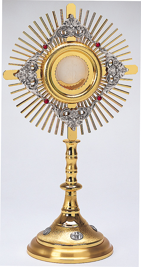 Monstrance - Two-tone Gold Plated With Oxidized Silver Medallions on Base and Filigree on Face. Four Ruby Colored Stones on Face. 21"H., 11 1/2" Face, 7 1/4" Base, WT. 5 1/2 lbs. Clip-Style (Glassless) Luna Holds Any Size Host Up To 3"