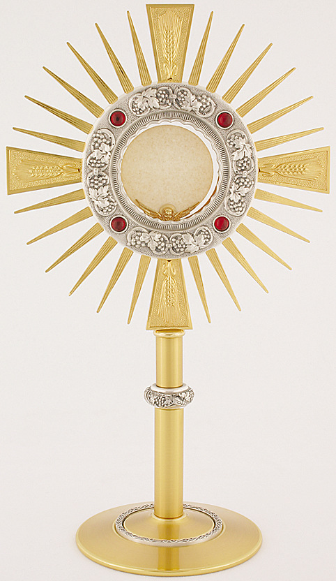 Monstrance - 24k Gold Plated, Antique Silver Node and Ring on Base. Four Ruby Glass Stones on Face. 15 3/4" H., 5 1/2 " Base. Clip-Style (Glassless) Luna.