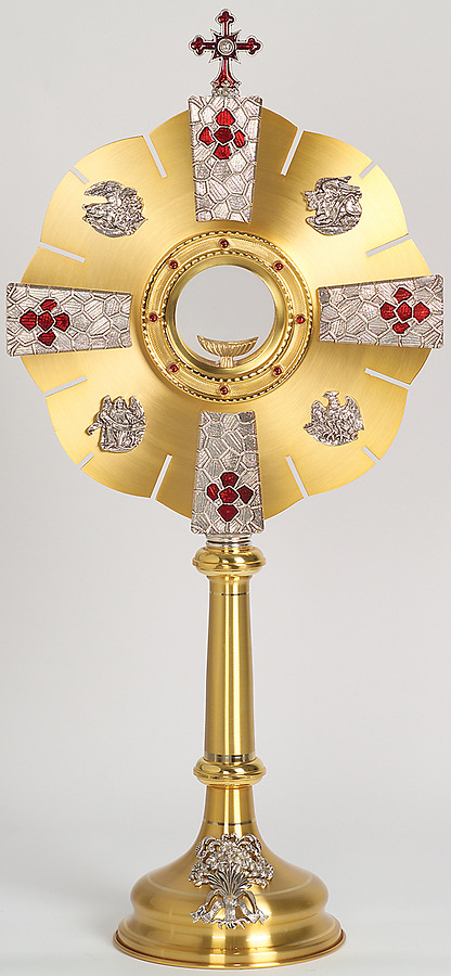 Monstrance - Two-tone Bright And Satin Finish. Gold Plated With Oxidized Silver Detailing. Stones Are Red With Enamel Crosses on Face. 28"H., 13" Face dia., 7" Base. Clip-Style (Glassless) Luna.
