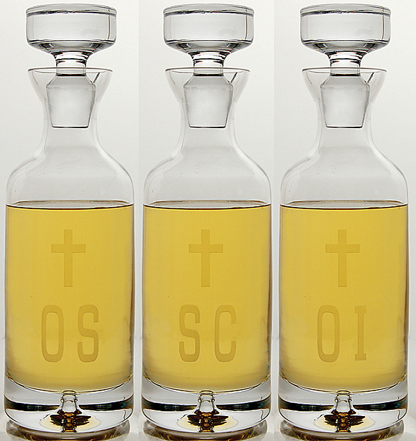 AMBRY SET - HAND-CUT IMPORTED CRYSTAL WITH POURING LIP. ENGRAVED OI, OS, SC ALSO AVAILABLE IN OC.12' H INCLUDING STOPPER, 3 3/4" DIA. BASE, 32 OZ CAP. SET OF 3.