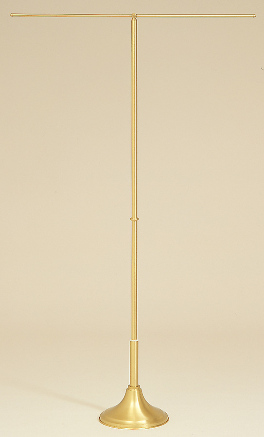 Processional Banner Stand, Brass Satin Finish. Furnished with a removable telescoping shaft which extends 51" to 90". 10 1/2" base, 36" cross arm. Made in the USA.