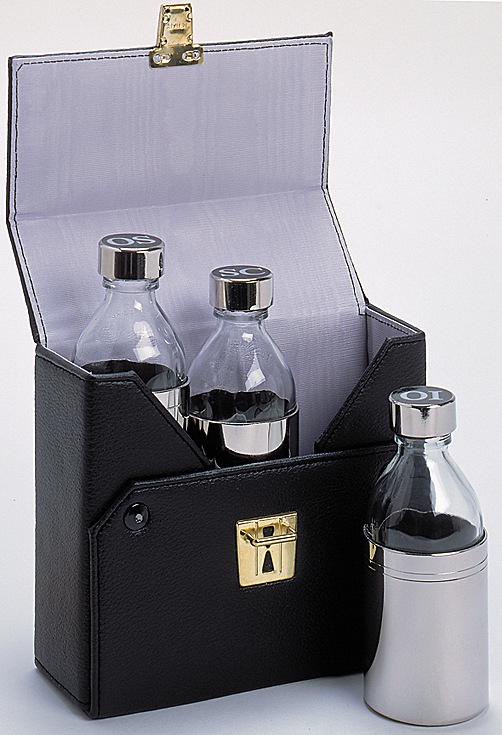 AMBRY SET - THREE LEAK-PROOF CAP BOTTLES, LABELED OI, OS, SC, 5 1/2"' H CASE, 4 OZ CAP.