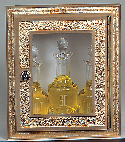 THIS AMBRY HAS A PLEXIGLASS WINDOW, BRONZE FACE. STAINLESS STEEL BOX. FACE MEASURES 12" H X 10" W, BOX MEASURES 11" H, X 9" W. X 6" D.