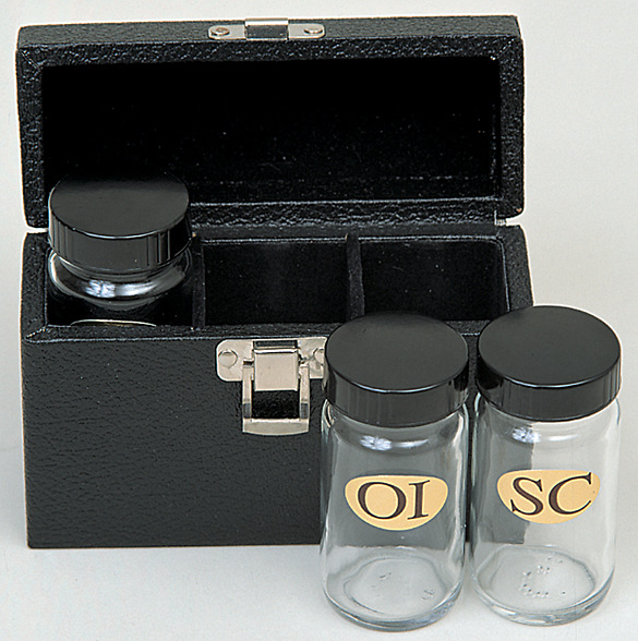 SACRISTY OIL SET - THREE GLASS CONTAINERS, WITH POLY VINYL LEAK PROOF CAP, LABELED OI,OS,SC, 2 OZ. CAP. 3 3/4"H., X 6" W CASE.