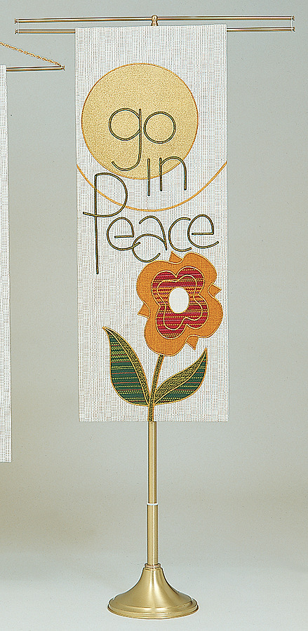 A Processional Banner Stand with a telescoping shaft that extends 51" to 90" with a 32" double cross arm and a 10 1/2 ' base. All in a Brass Satin Finish. Made in the USA.