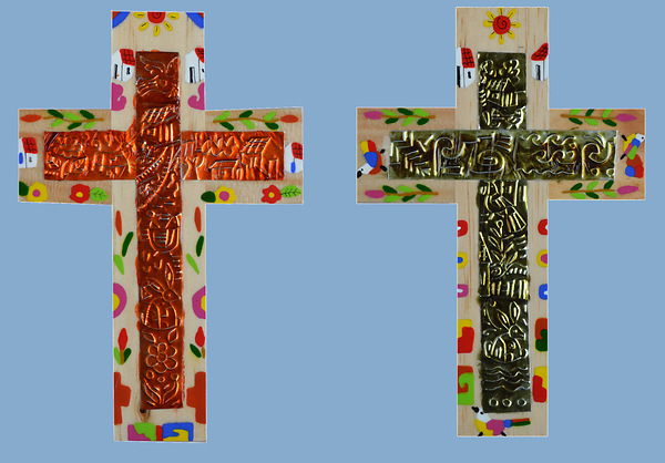 7" wooden cross with colorful, painted border and metal cross in center. Handmade; color and design will vary. El Salvador