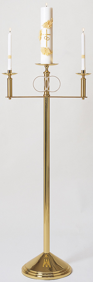 Floor Wedding Candelabra. Solid brass. 50"H. x 22"W. 12" weighted base. Center adapts to any candle. Silver plated rings, 7/8" sockets. Side candles removable for lighting. Candles not included.