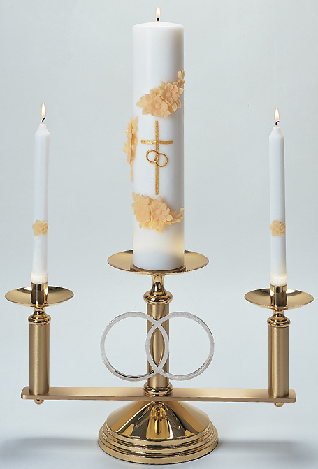 Solid Brass Wedding Candelabra is 10 3/4" H x 18" W., 7" Base 7/8" Sockets. Center adapts to any candle. Silver Plated Rings. Candles sold separately.