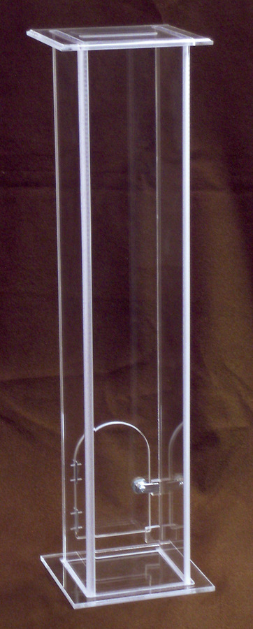 This beautiful collection box is made in the USA of 1/2" thick acrylic. Tithes and offerings are inserted into the top of the box, where it can later be retrieved through a locking door at the base. This collection box is 36" high, 9 ½" wide and 9" deep. Weight is 30 lbs.