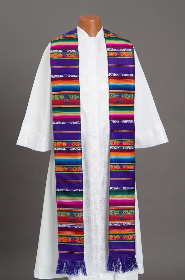 These paraments include a cross design embroidered on traditional Ecuadorian fabrics. The colors are vibrant and unlike most other liturgical pieces.