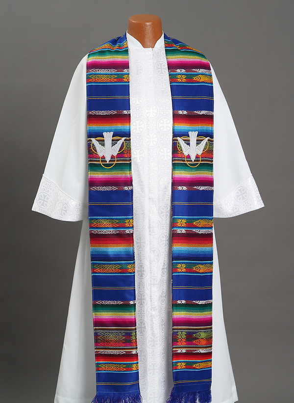 These paraments include a cross design embroidered on traditional Ecuadorian fabrics. The colors are vibrant and unlike most other liturgical pieces.