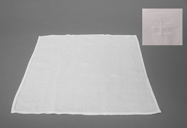 This corporal is made of 100% cambric linen that is finely woven and features an embroidered white Latin Cross at the edge. Machine washable. Sold in packs of 3. Dimensions: 20" x 20". Imported.