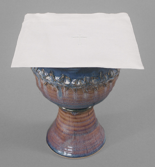 A chalice pall is a square fabric cover with plexiglass inserted to stiffen (similar to a pillow case). It is used to cover the chalice during communion.