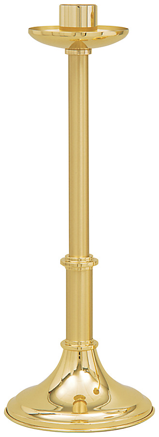This paschal candle holder features a low profile and is made in the USA of brass in a two-tone finish. Dimensions: 28" high, 10-1/2" base, 2-1/2" socket.