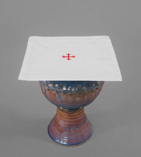This chalice pall is made of 100% cambric linen that is finely woven and features an embroidered red Cross in the center. Machine washable. Sold in packs of 3. Dimensions: 7" x 7". Imported. Plexiglass insert is not included.