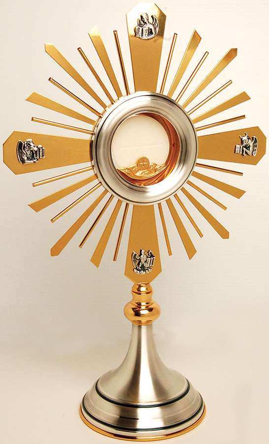 Monstrance 24k gold and oxidized silver plated with four evangelists on face.