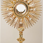 Monstrance 24k gold plated with silver plated filigree and four oxidized silver medallions on base.