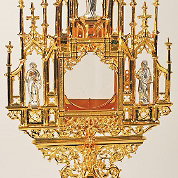 Monstrance 24k gold plated with silver plated statues and emblems on node.