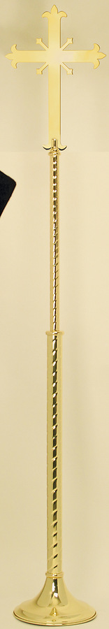 Highly polished and clear lacquered brass processional cross. Breaks at node. 80"H., 10-1⁄2" base, 13" x 19" cross. 42"L. carry section, wt. 5 lbs.