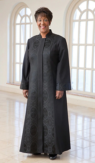 Robe has an A-line silhouette with princess seams with brocade on the front and sleeve cuffs. Be aware this robe runs large in it's sizing. Semi-fitted. Features a front placket with full length concealed zipper with mandarin collar. Available with flared sleeves, full sleeves, or full sleeves with doctor bars. Note that full sleeves wil remove cuff brocade. Side seam pockets with microphone cord openings. Available lined or unlined. Fabric is a linen look made of 70% Polyester/30% Rayon. Brocade is 100% Polyester. Available in black, white, or ivory.