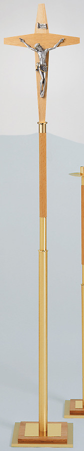 Processional Crucifix. Combination oak and satin brass. Antique silver corpus and INRI. 72"H., 10" sq. base. 44"L. carry section, wt. 5 lbs.
