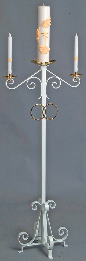 Wedding Candelabra. 50"H. x 22"W., 14" base, 7/8" sockets. Center can accommodate any size unity candle. White durable powdercoat finish with brass accents.