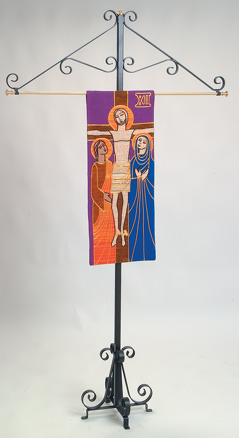 Banner Stand. 14" base. Black durable powdercoat finish with brass accents. Telescopes from 5´ to 8´. Accommodates all 36" banners.