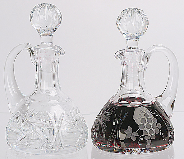 Crystal Cruets. 6-1/4"H., 3-1/2" dia. base, 6 oz. cap. Grape and leaf design on wine, pinwheel design on water. Pair