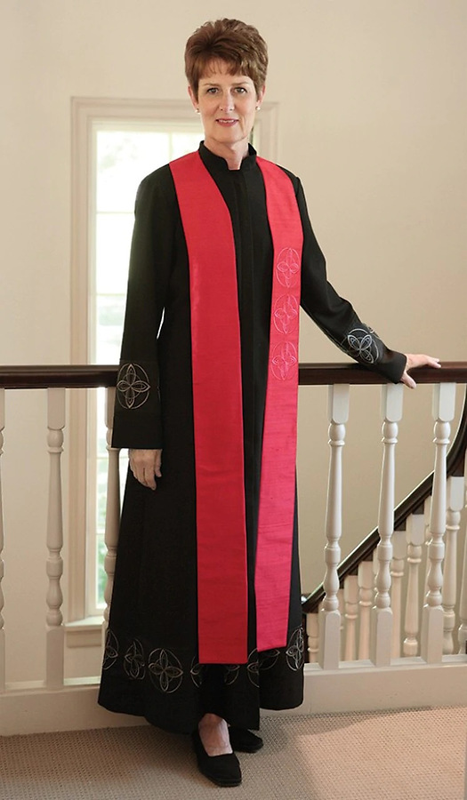 Robe is semi-fitted with waist darts at front and back for a flattering shape. Also has an inset of Crossroads embroidery around hem and sleeve cuffs. Features a front placket with full length concealed zipper with mandarin collar. Available with strasight sleeves (as shown), full sleeves, or full sleeves with doctor bars.Full sleeves wil not have sleeve emboidery. Side seam pockets with microphone cord openings. Available lined or unlined. Fabric is a linen look made of 70% Polyester/30% Rayon. Also available in white Stole as shown not included.