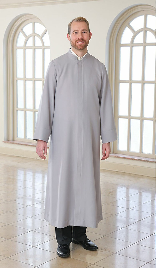 The David robe from Abiding Spirit features classic styling and is hand crafted from your choice of fine fabrics. Made of 100% Polyester Poplin this robe features a sraight/tailored fit with a stand up collar and the option of flared sleeve, full sleeve, or full sleeve with doctor bars, Other features include front placket with full length concealed zipper and two slits for access to your pockets.Robe is available lined or unlined and in sizes from Small to XXXL. Also availble in linen-look white, off-white or black.