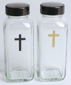 Cruets. 4-1/2”H. x 1-3/4” x 1-3/4”, 4 oz. cap. Glass with black lid. One with black cross and one with gold cross.