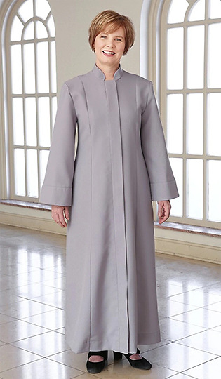 Robe has an A-line silhouette with princess seams. Be aware this robe runs large in it's sizing. Features a front placket with full length concealed zipper with mandarin collar. Available with flared sleeves, full sleeves, or full sleeves with doctor bars. Side seam pockets with microphone cord openings. Available lined or unlined. Fabric is a linen look made of 100% Polyester. Also available in black, ivory, grey, or royal blue.