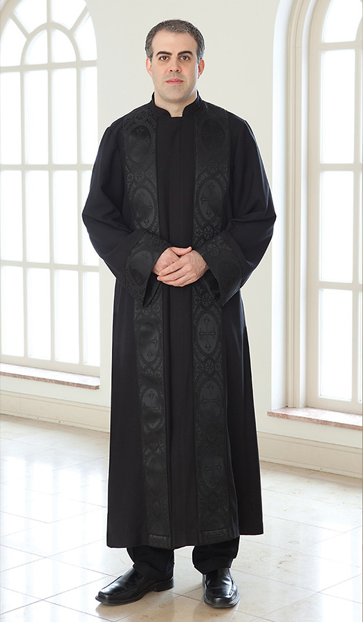 Robe is a straight cut, a modern fit to a classic pulpit robe with a stand up collar and a front placket with full length concealed zipper. Options include choice of cross or swirl brocade pattern and choice of full, flared, or flared with doctor bars sleeves. Also features option for one or two slits (one each side) for access to your pockets. Available lined or unlined and in white, off-white, or black. Dry clean only.