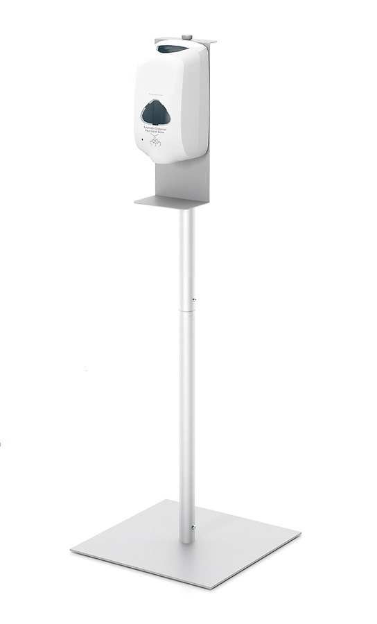 This floor stand is a great way to display manual or automatic hand sanitizer dispensers wherever they need to be readily available. Made in the USA of durable powder coated steel in silver finish. Stand is 48" tall (fixed height), tube is 1-1/2" in diameter and separates into two sections. Base is 16" square. Weight less that 9 lbs. Felt pads are on the bottom of base for ease on floor. Can hold most brands of dispensers via mounting holes (28 mm and 64 mm widths) or via double sided tape. Mounting area is 6" wide by 14.5" tall. Dispenser not included.