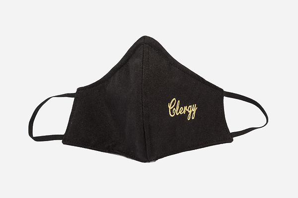 Fused with Liberty fabric (polyester) with a fused Liberty lining, this mask offers four layers of high level protection not typically seen in a cloth mask. Features the word "Clergy" stitched in gold on the side. Also has a thin wire shaping structure sewn into mask for a contoured fit and elastic straps to go around ears. Made in the USA.