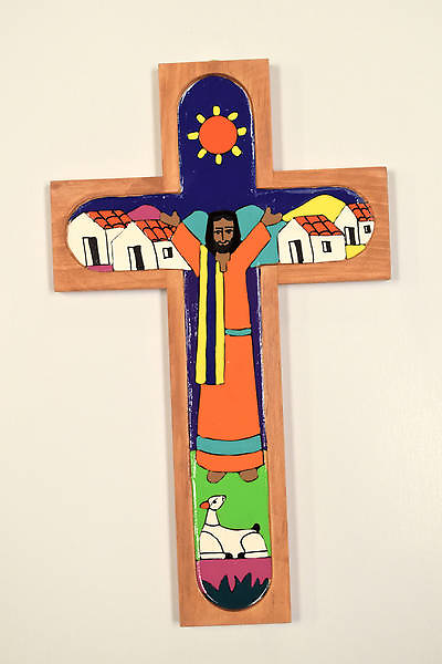 This beautiful hand crafted wooden, brightly painted Resurrection Cross is made by artisans in El Salvador. Measures 7"H.