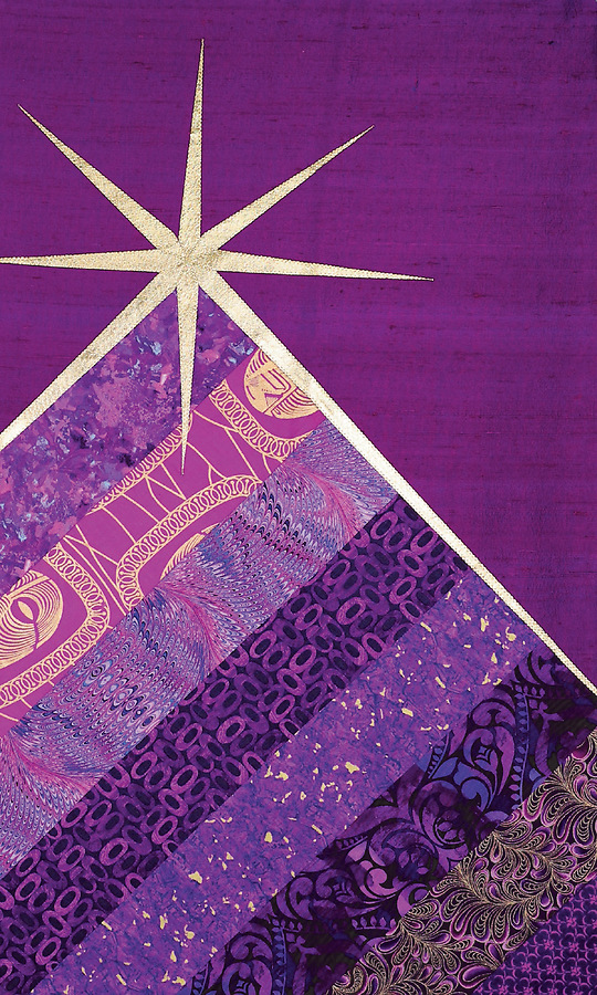 This striking design is a variation of our Triumphant design featuring a selection of cotton prints and batiks in diagonal bands and luxurious silk dupioni separated by a faux leather metallic gold star makes this a beautiful choice for the season of Advent.