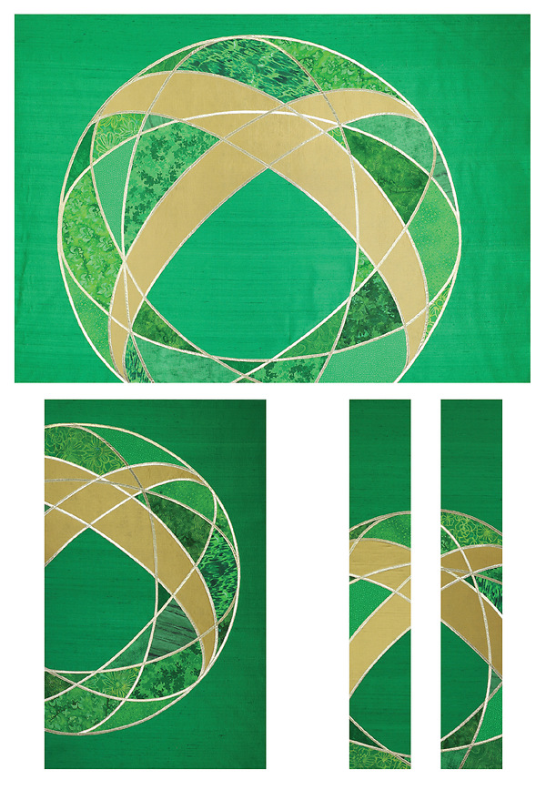Our For God So Loved the World design is a base of green silk dupioni with overlapping circles of gold lame` to create a cross of gold wrapped around the Earth. The shapes between the lines are filled in with cotton prints and batiks creating an elegant and meaningful design perfect for Ordinary Time.