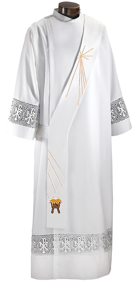 Elegant appliqué and embroidered chasuble available in beautiful white Aventura fabric, perfect for any Christmas celebration.