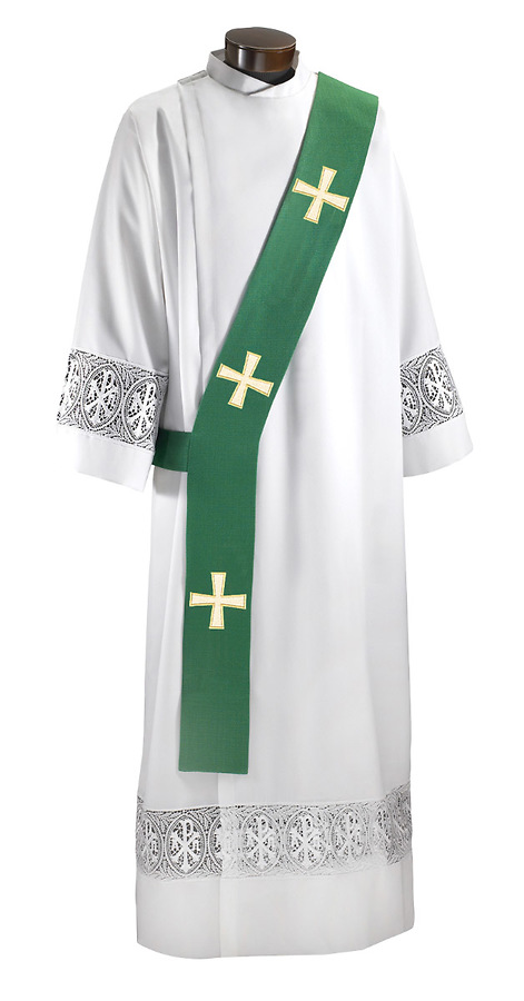 The 6602 Multi - Season Deacon Stole Collection offers designs to reflect the Liturgical calendar with traditional colors. Meticulously embroidered and appliquéd designs embellish these items to further echo the season of worship. Beautiful Deacon stole, perfect for any Ordinary Times celebration. Beautiful green fabric and adorned with rich satin lining and a stunning gold plated chain.