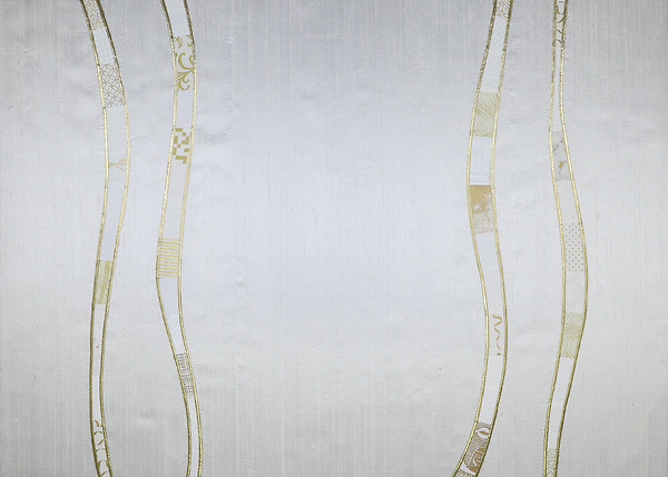 The River of Life design features a selection of cotton prints—some white on white, and some with gold metallic overprinting--in undulating ribbons bordered in gold lame’ on a base of luxurious white silk dupioni. It is one of our most versatile designs making this a lovely choice for the seasons of Christmas and Easter.