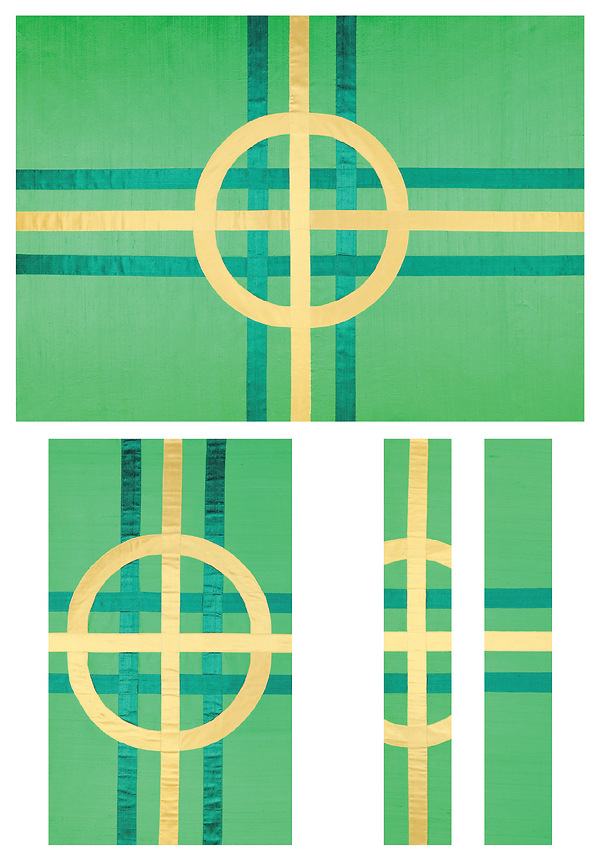 This design adds a circle and a horizontal series of stripes to the vertical to create a stylized cross on a green silk dupioni base making this a design that works perfectly for Ordinary Time.