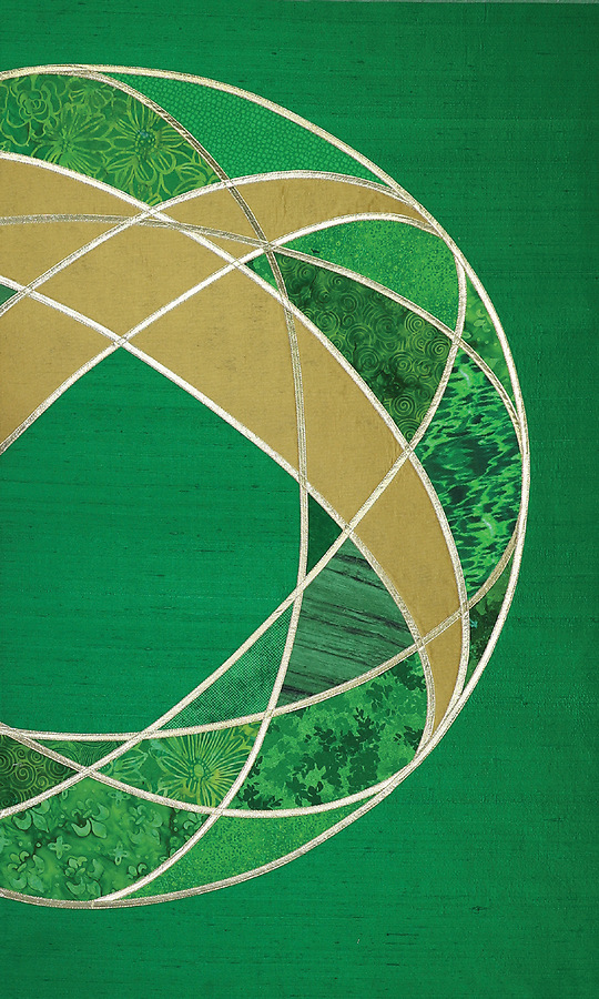 Our For God So Loved the World design is a base of green silk dupioni with overlapping circles of gold lame` to create a cross of gold wrapped around the Earth. The shapes between the lines are filled in with cotton prints and batiks creating an elegant and meaningful design perfect for Ordinary Time.