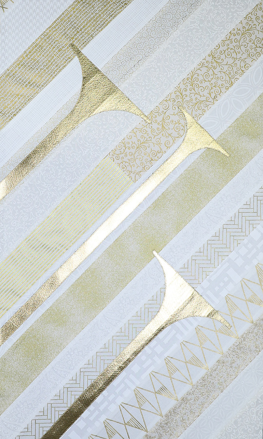 This pulpit parament combines a selection of cotton prints—some white on white, and some with gold metallic overprinting--in diagonal bands accented with faux leather metallic gold herald trumpets and lined in complimentary cotton making this a versatile design for Christmas and Easter services.