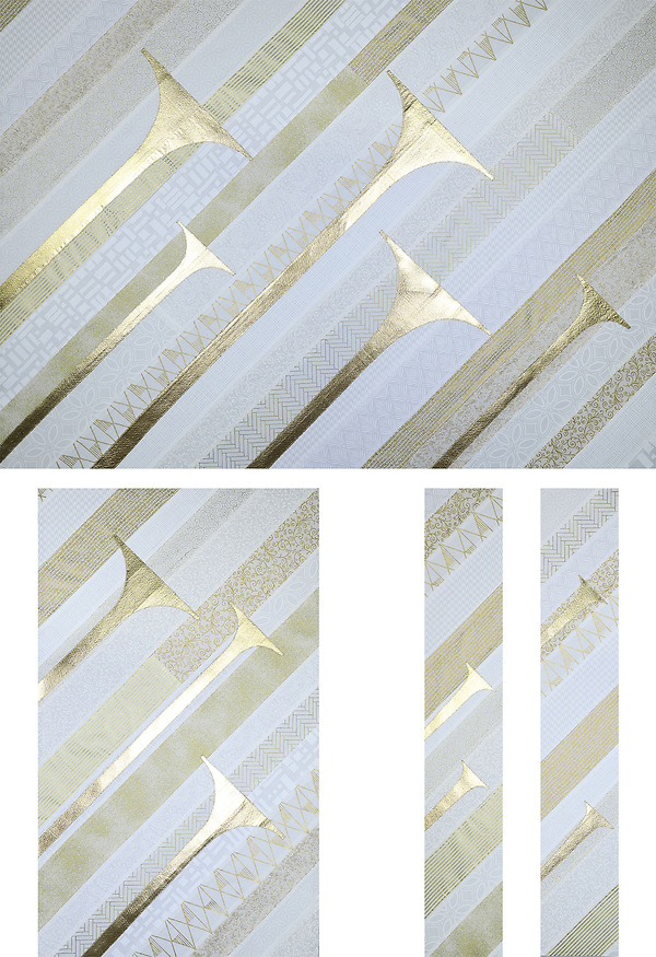 This simple parament style combines a selection of cotton prints—some white on white, and some with gold metallic overprinting--in diagonal bands accented with faux leather metallic gold herald trumpets and lined in complimentary cotton making this a versatile design for Christmas and Easter services.