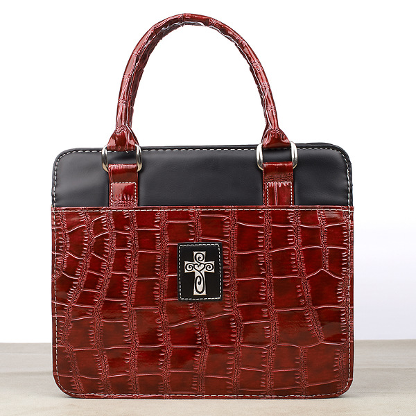 This glossy bible/book cover fashioned of burgundy embossed croc has the look of a modern accessory. With rolled reinforced handles it easily holds your bible and books sized up to 6.625" x 9.5" x 1.5". It features: