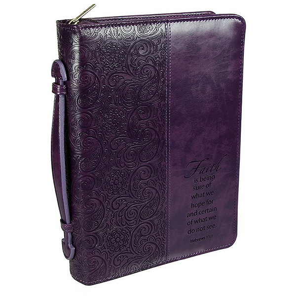 Medium Bible Cover features heat debossed scripture, cross zipper pull, and pen loop.
