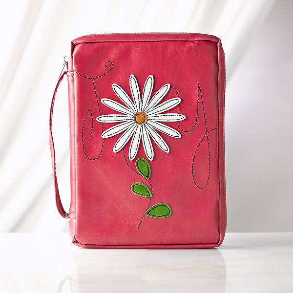 Pink Joy Leather look Bible cover with Applique flower has screen printed Psalm 16:11 on the back. Includes zipped mesh interior pocket, zipped exterior pocket and pen loop.