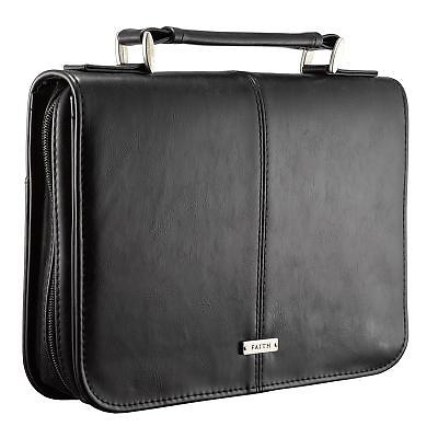 Black Lux-Leather Large Bible Cover with a metal cross badge, Exterior Pocket, Zipped interior Mesh Pocket, Pen Loopand Cross zipper. It is 6.625" x 9.5" x 2" in size